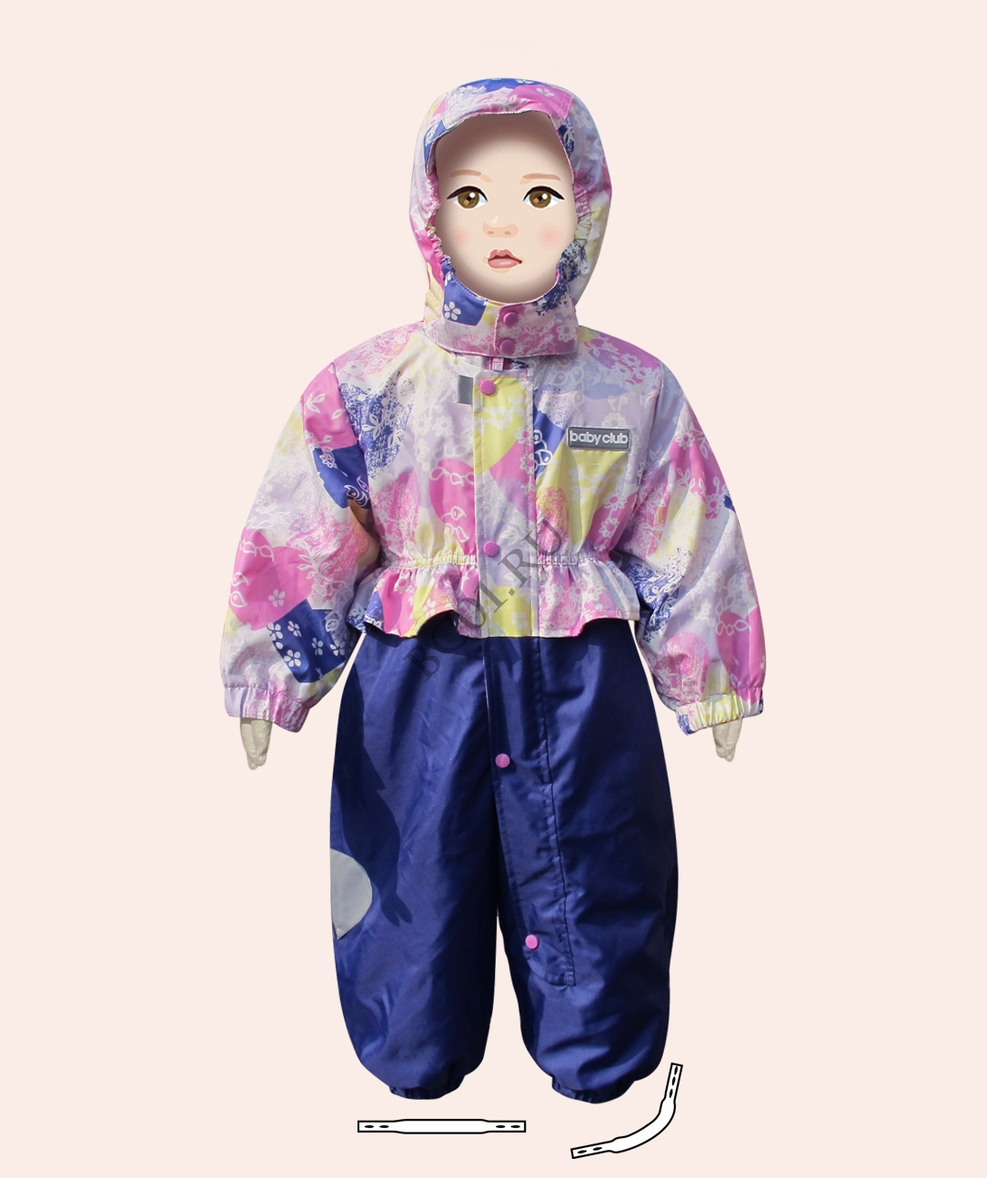 Низ изделия с резинкой и силиконовыми штрипками для фиксации на обуви, ветрозащитный клапан закрывающий молнию, удлиненная центральная молния для более удобного одевания ребенка.
