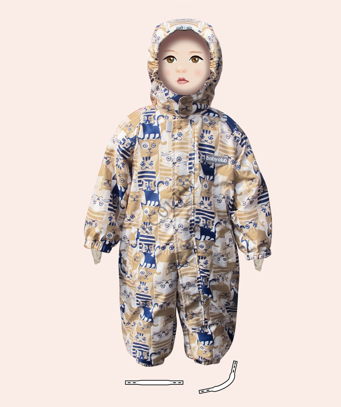Низ изделия с резинкой и силиконовыми штрипками для фиксации на обуви, ветрозащитный клапан закрывающий молнию,удлиненная центральная молния для более удобного одевания ребенка.