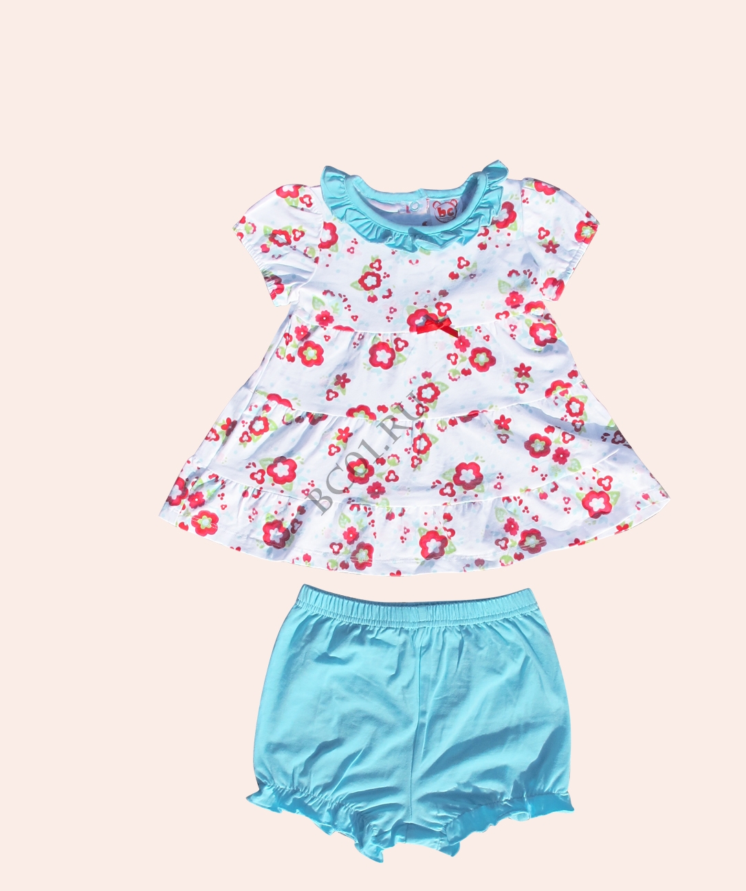Летний комплект для девочки. Удобное укороченное платье и объемные штанишки из хлопка. Платье застегивается на кнопки сзади, штанишки на мягких резинках на талии и вокруг ножек не натирают и не сковывают движения малышей.