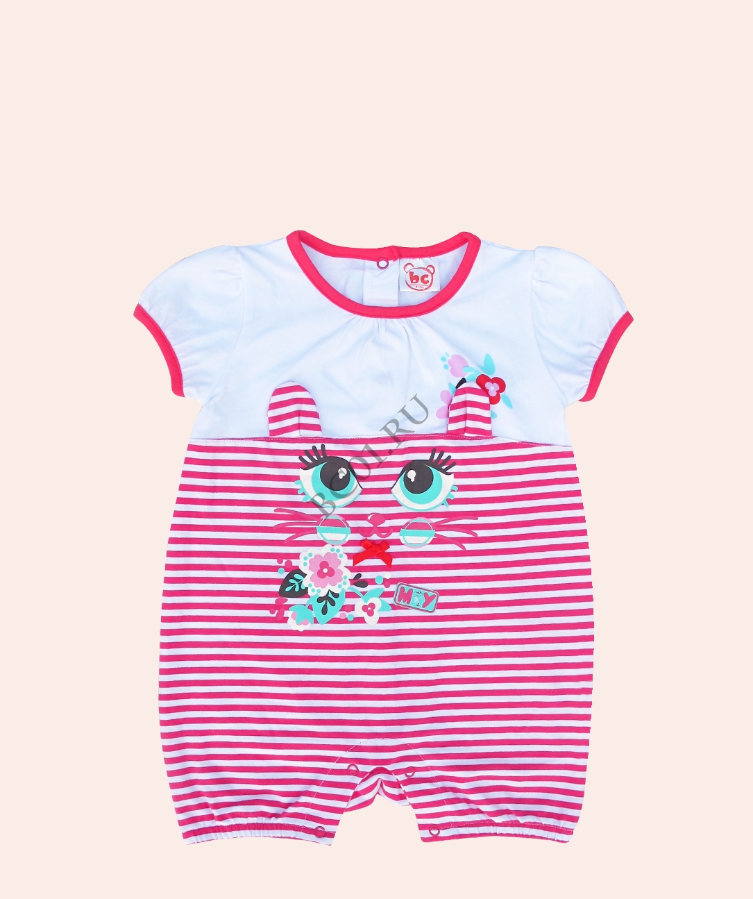 Мягкий, безопасный хлопок; окантованный круглый вырез; застежка на кнопки на спинке и по шаговому шву. Металлические кнопки не содержат никеля, окрашены в тон трикотажного изделия и после стирок не ржавеют.